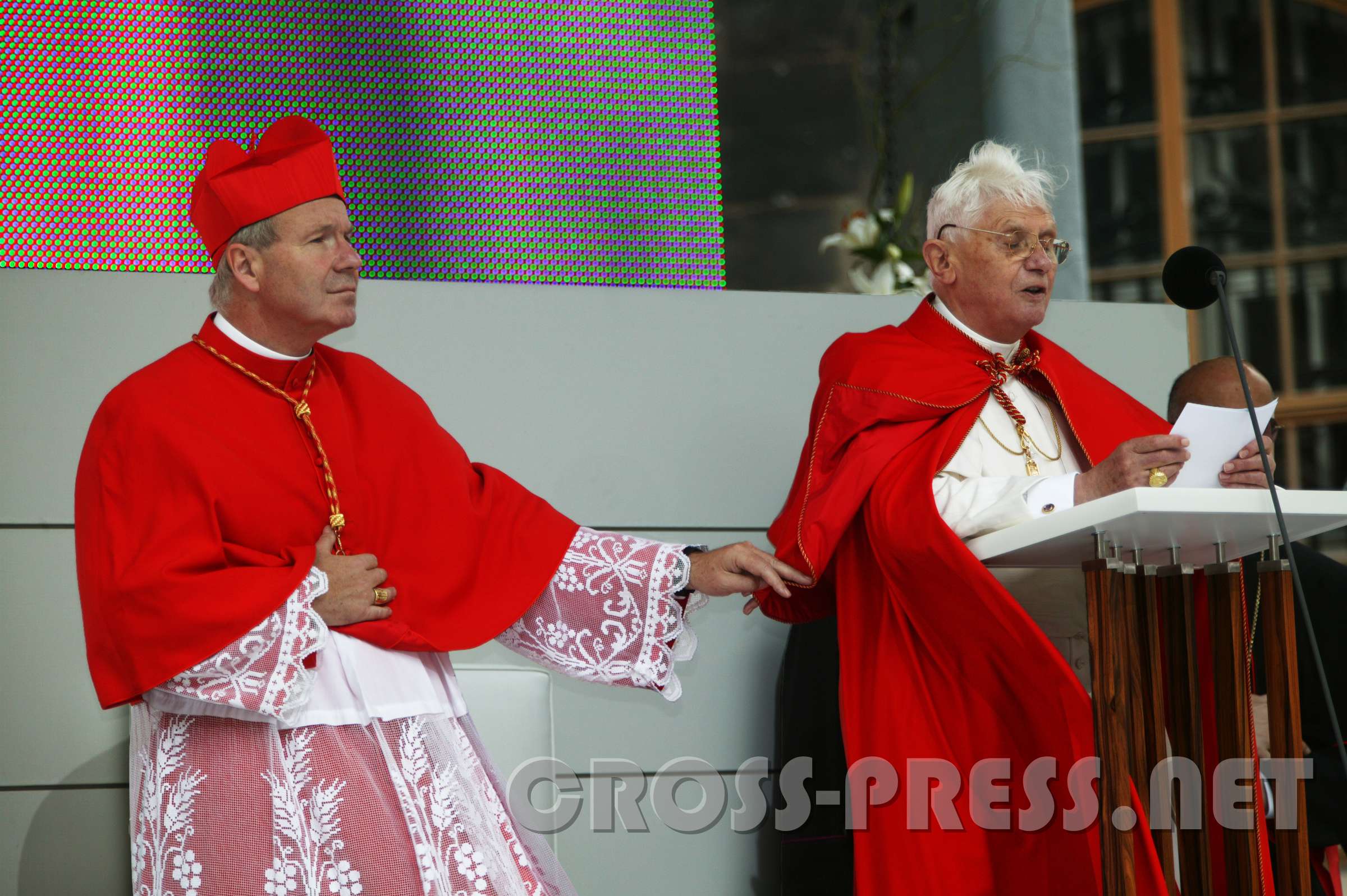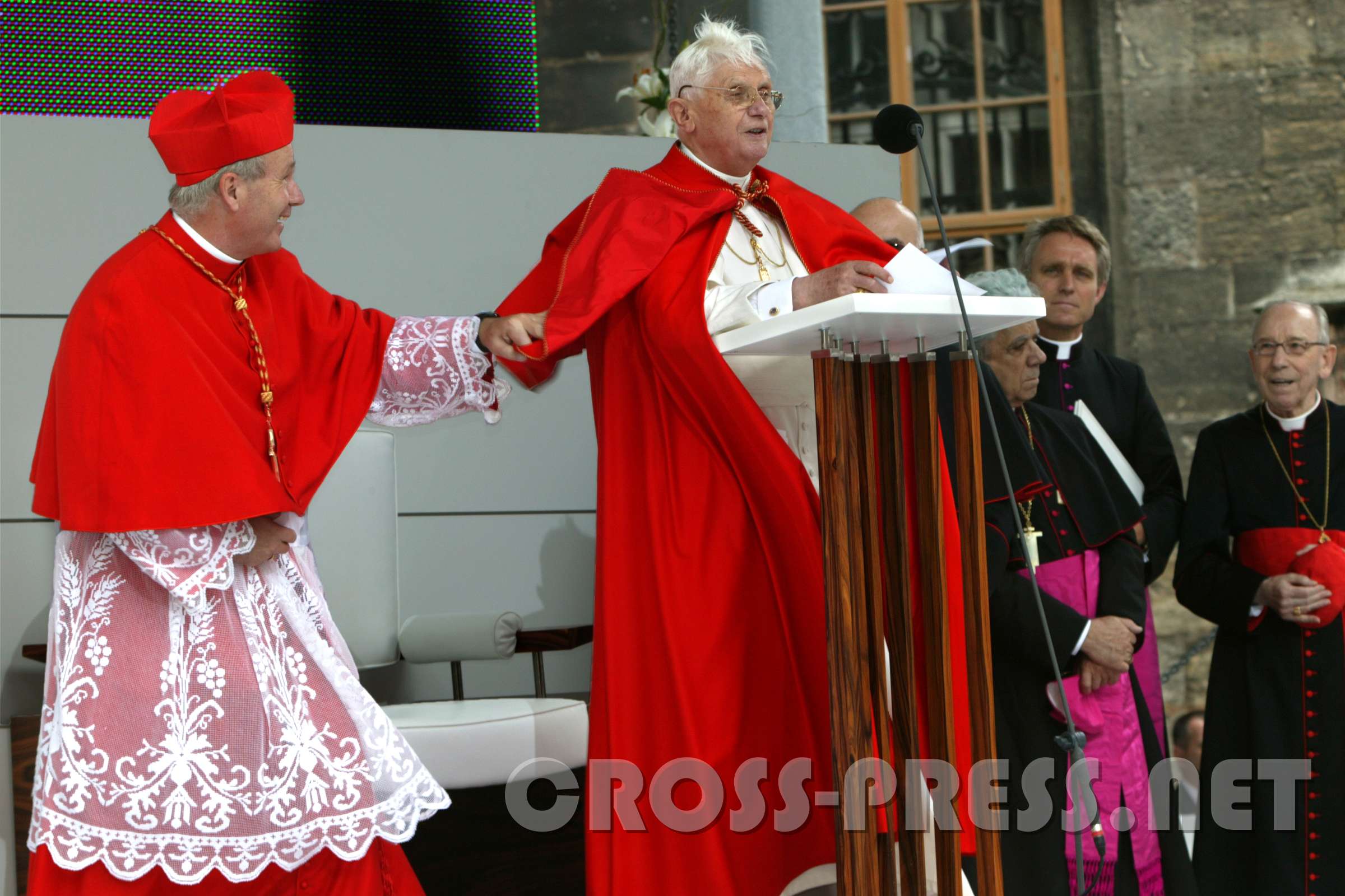 "Bleib da, Joseph !" Kardinal Schönborn eilte seinem langjährigen Lehrer zu Hilfe, als ihn eine Windböe zu entrücken drohte und hält lachend Papst Benedikts…