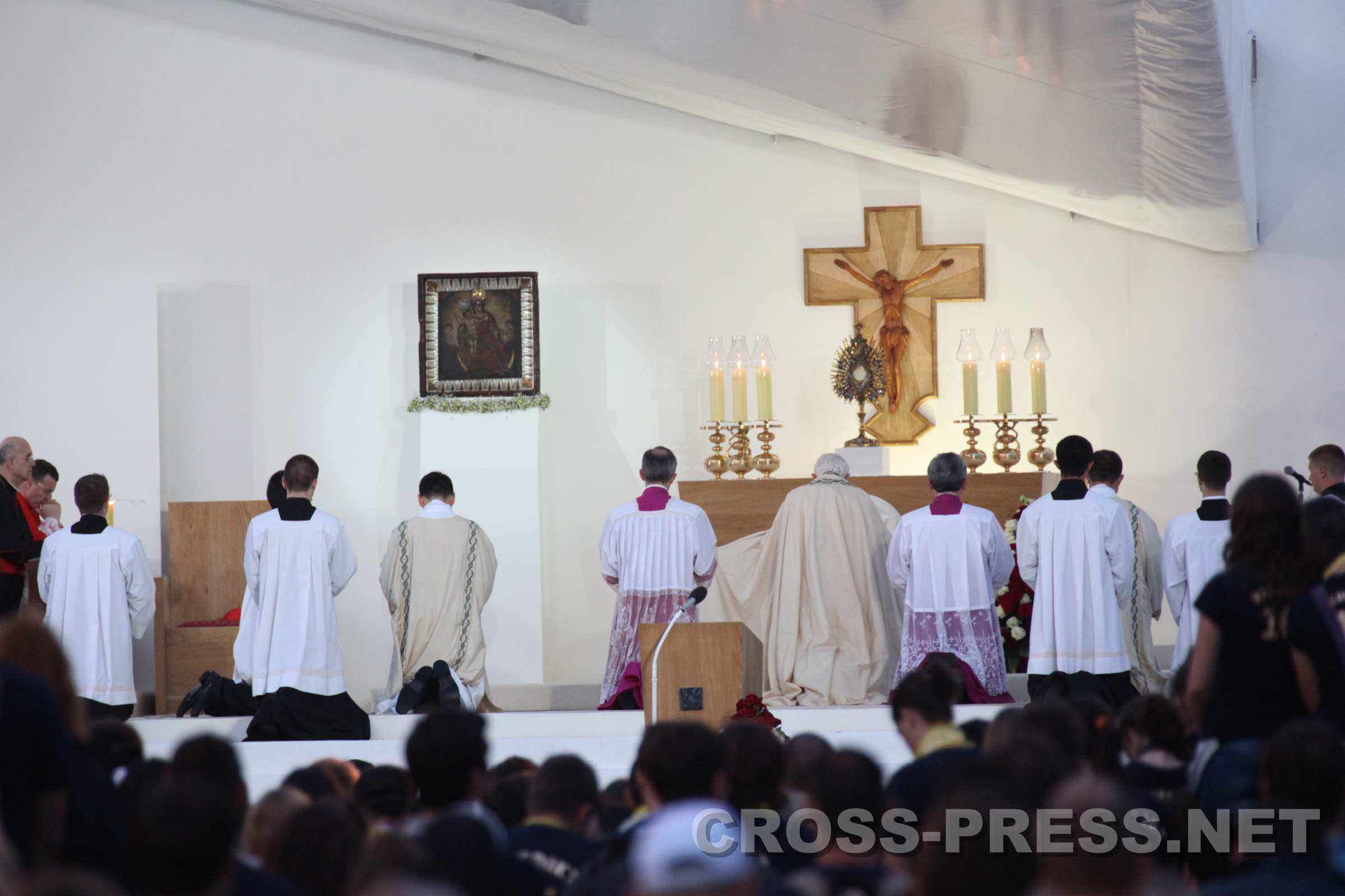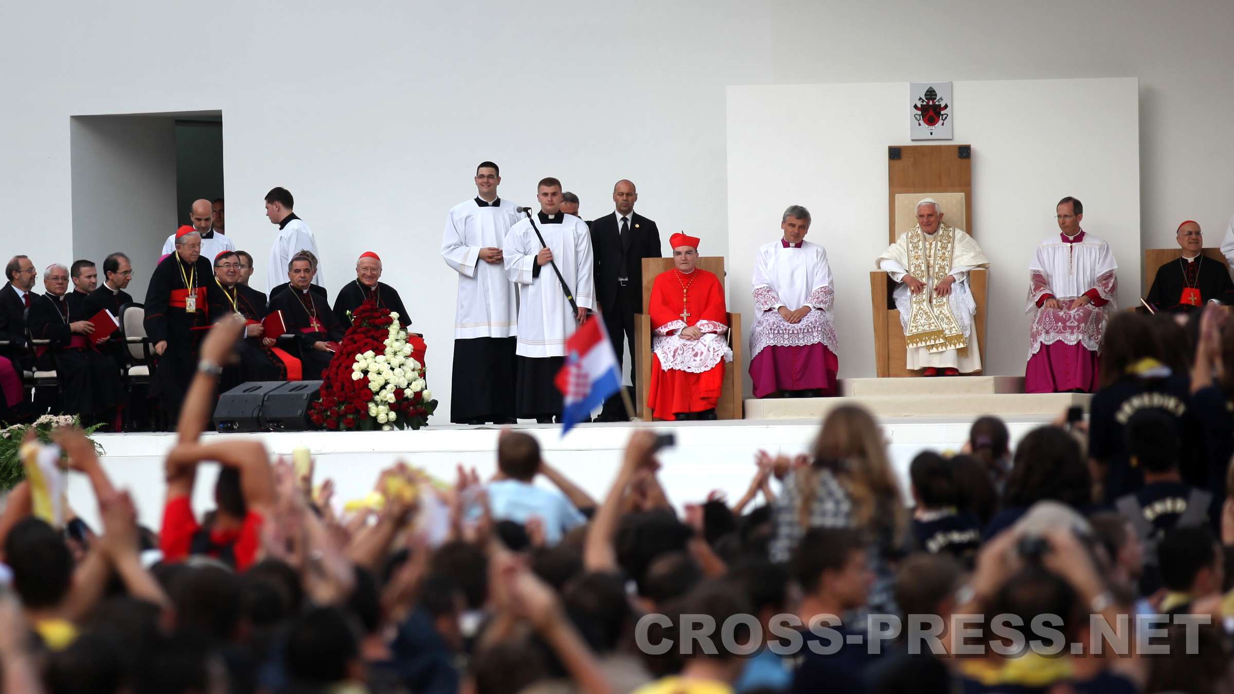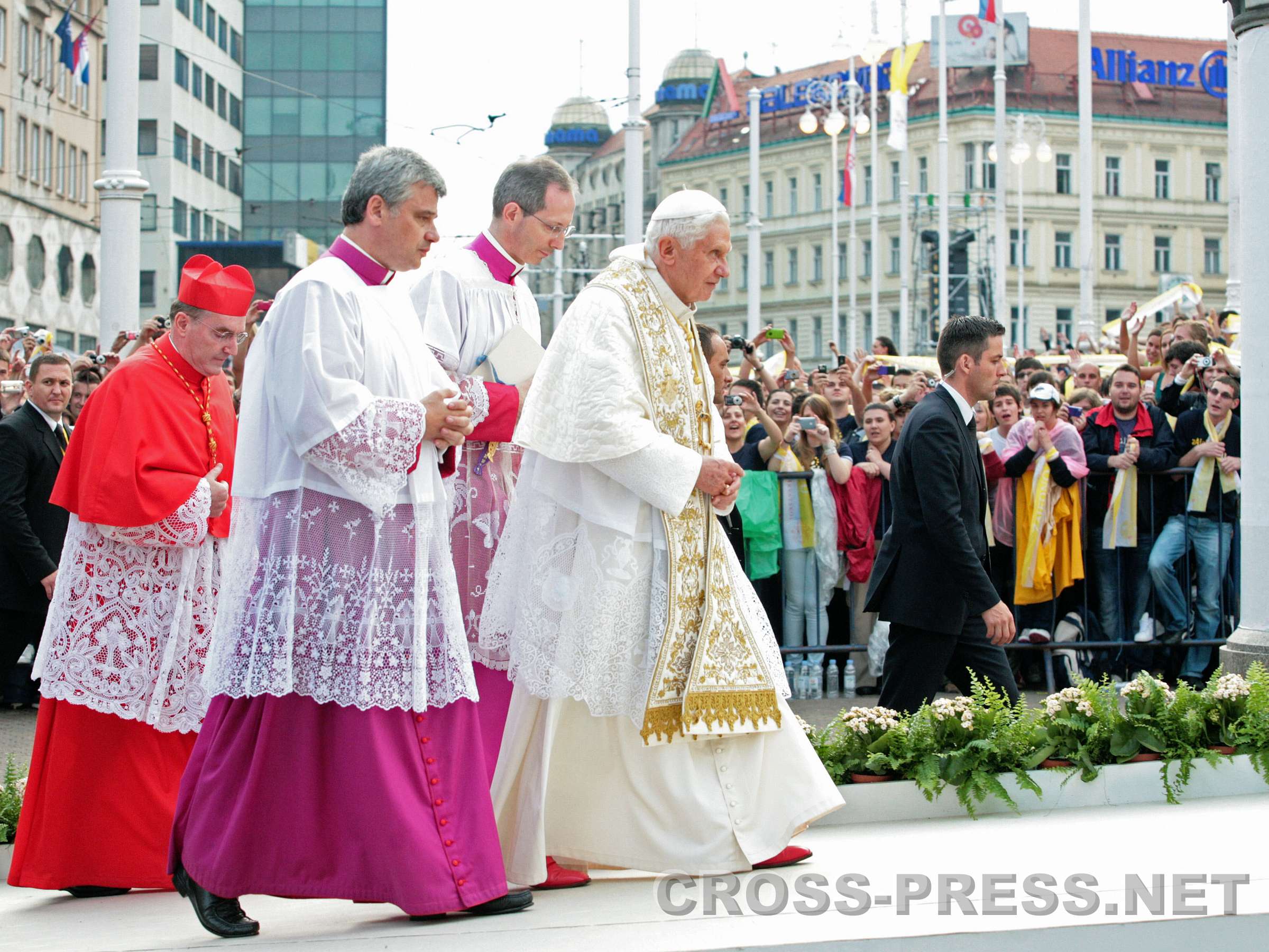 Vigil mit Jugendlichen, Jelačić-Platz, 04.06.2011, 19:30 "Papst, wir lieben Dich!" "Eure Anwesenheit verwandelt diesen geschichtsträchtigen Platz in einen Tempel", sagte der Papst zu den 26 Tausend Jugendlichen auf dem Banus Jelačić - Platz, dem Hauptplatz von Zagreb. Noch einmal fast so viele Menschen versammelten sich vor der Kathedrale und in den umgebenden Strassen. In seiner Ansprache hob der Papst den Jugendlichen das Beispiel des kroatischen seligen Ivan Merz, der schon in seiner Jugend zu einem überaus festen Glauben fand, hervor. Nach Zeugnissen zweier Jugendlichen, der Lesungen aus der Bibel und viel guter jugendlichen, kroatischen und internationalen geistlichen Musik wurde das Sakrament des Brotes ausgesetzt. Der Papst verharrte kniend eine gute viertel Stunde in stiller Anbetung und mit ihm die Jugendlichen. Die ganze Zeit herrschte eine tiefe, fast übernatürliche Stille ... nur das Zwitschern der Schwalben begleitete die gemeinsame Adoration. Auch den Papst dürfte etwas beeindruckt haben, was ihm bei seinen Reisen sicherlich nicht oft passiert. Mehrmals ertönte der Jelačić-Platz laut von den Sprachchören der Jugendlichen: "Papa, mi Te volimo !" (Papst, wir lieben Dich). |