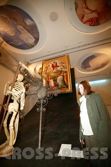 | KAMERA: Canon EOS-1DS | DATUM: 27.04.07 20:06 | AUFLÖSUNG: 4064 x 2704 | ISO-EINSTELLUNG: 400 | BELICHTUNGSMODUS: Auto exposure | BELICHTUNGSDAUER: 1/40s | ÖFFNUNG: 2.8 | BRENNWEITE: 16.0mm | BLITZ: Flash fired | Headline: Feuer & Erde Ausstellungseröffnung | City: St.Peter in der Au | Copyright: Jerko Malinar | Caption: Für Christen endet das Leben nicht in der Erde, sondern es findet einen neuen Anfang in der Auferstehung. 'Christi Himmelfahrt', Georg Scheible, 17Jh., Benediktinerstift Kremsmünster. |