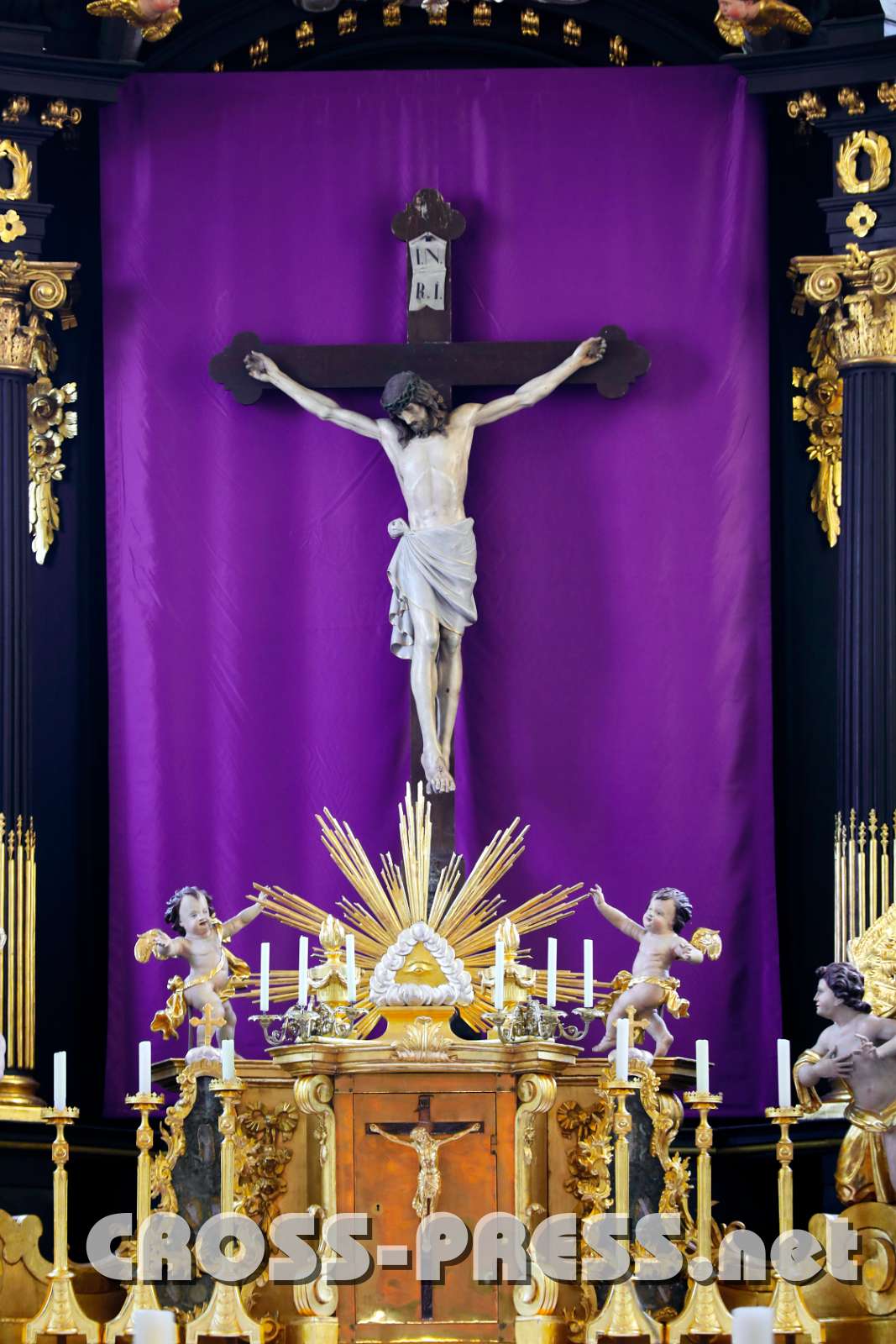 Die Stiftskirche ist verdunkelt, nur das Fastentuch leuchtet noch. Die Schmerzensstunden Jesu. O Du unschuldiges Lamm, was hast Du für uns gelitten !!!