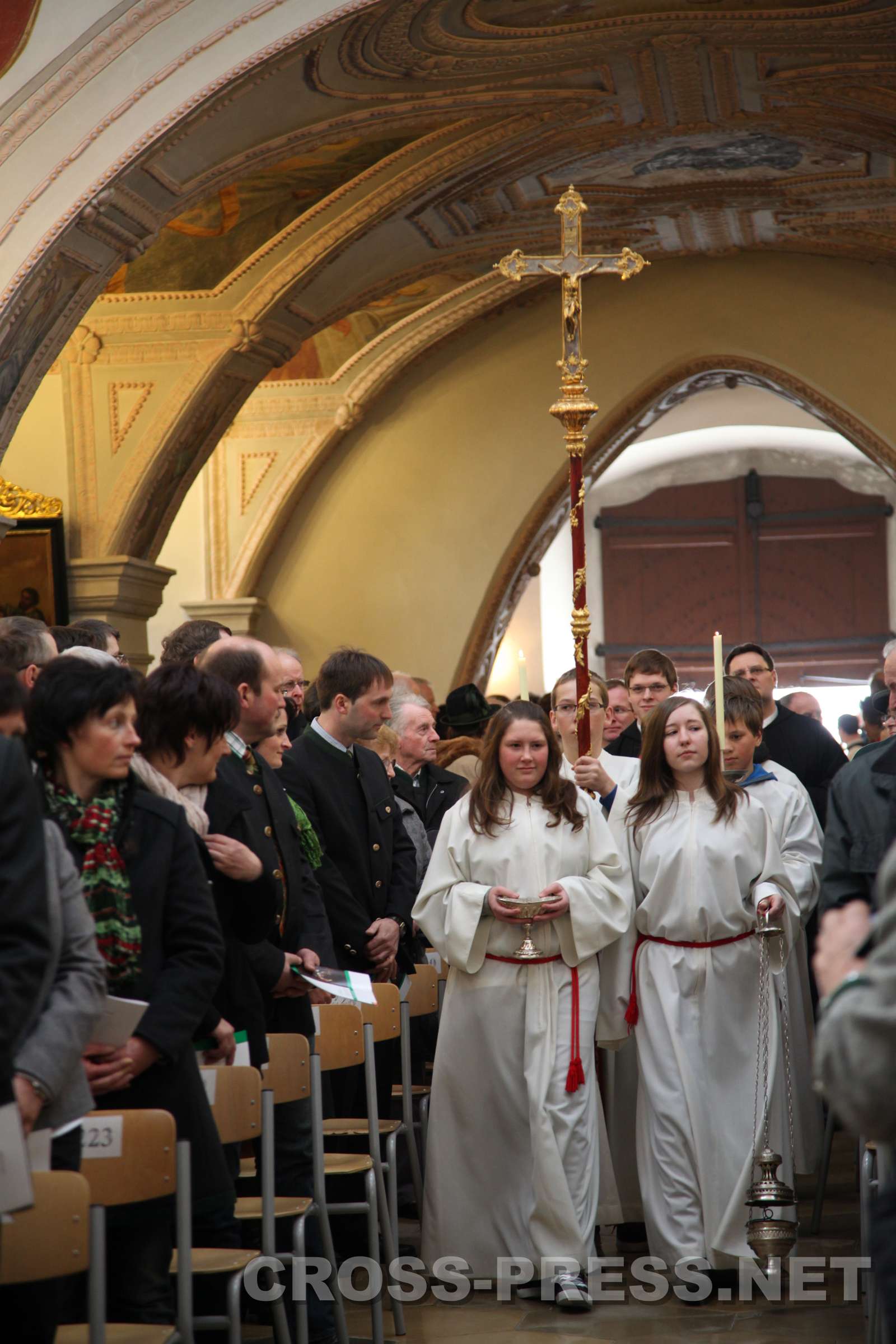 Die Ministranten führen den Festzug an: zu allererst die Weihrauchträgerin (Thuriferar) Miriam Deinhofer, gefolgt vom Kreuzträger.