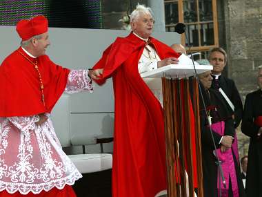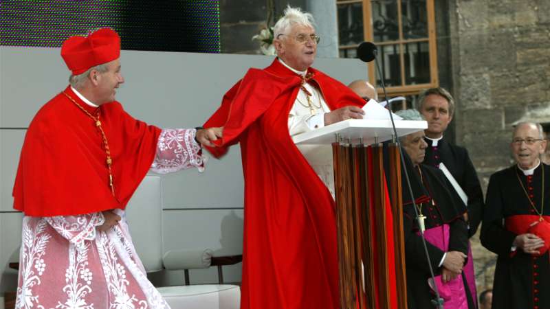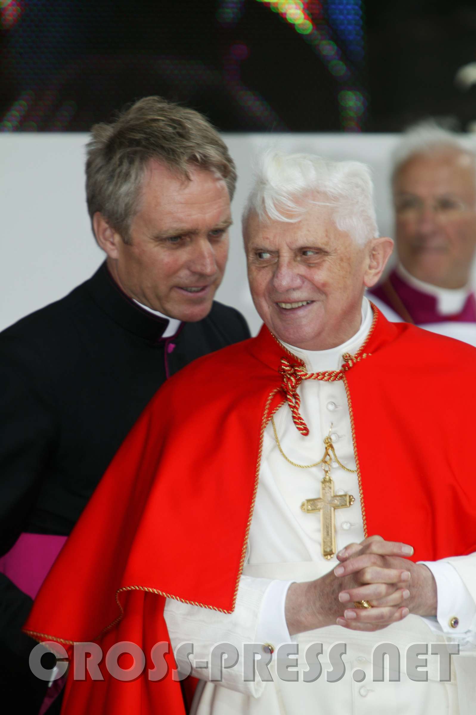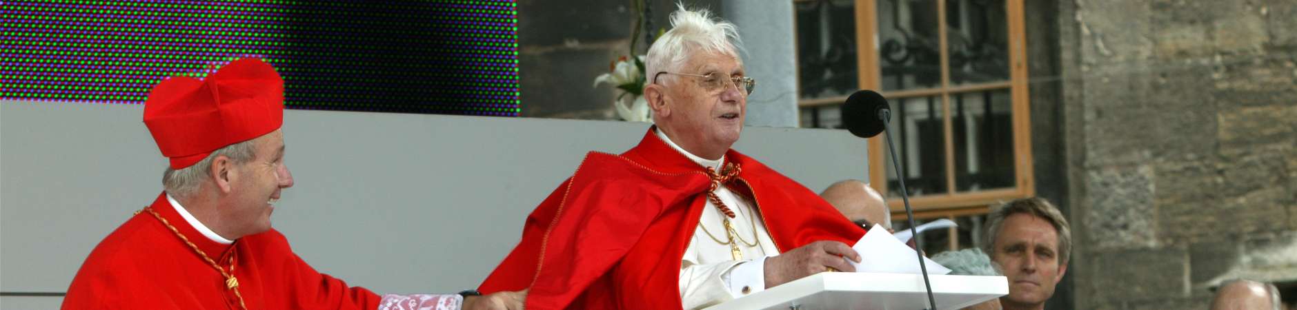 "Bleib da, Joseph !" Kardinal Schönborn eilte seinem langjährigen Lehrer zu Hilfe, als ihn eine Windböe zu entrücken drohte und hält lachend Papst Benedikts…