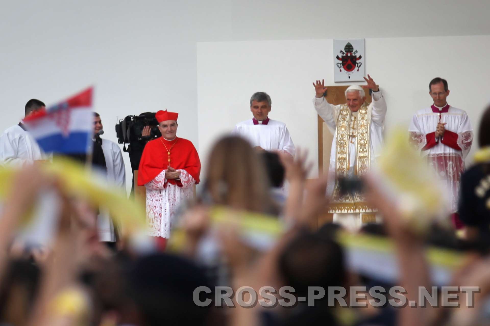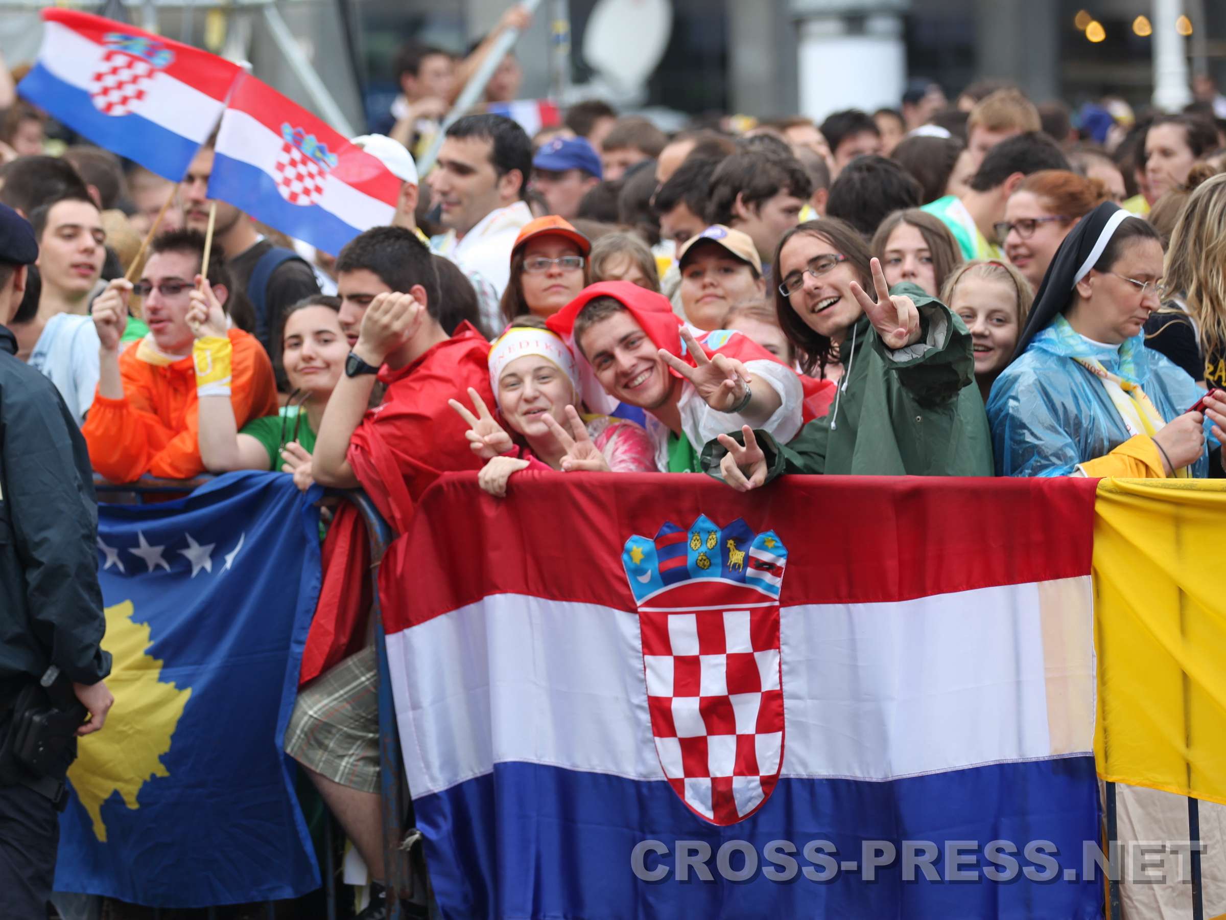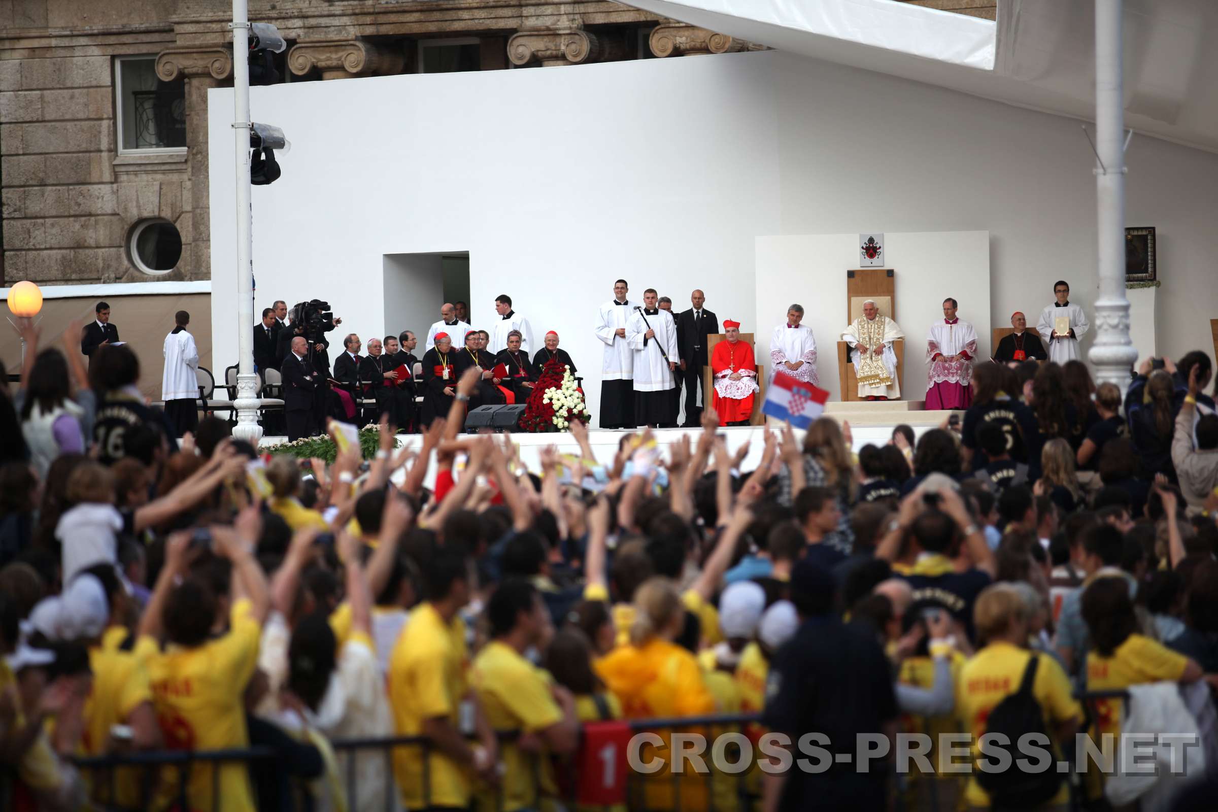 Vigil mit Jugendlichen, Jelačić-Platz, 04.06.2011, 19:30 "Papst, wir lieben Dich!" "Eure Anwesenheit verwandelt diesen geschichtsträchtigen Platz in einen Tempel", sagte der Papst zu den 26 Tausend Jugendlichen auf dem Banus Jelačić - Platz, dem Hauptplatz von Zagreb. Noch einmal fast so viele Menschen versammelten sich vor der Kathedrale und in den umgebenden Strassen. In seiner Ansprache hob der Papst den Jugendlichen das Beispiel des kroatischen seligen Ivan Merz, der schon in seiner Jugend zu einem überaus festen Glauben fand, hervor. Nach Zeugnissen zweier Jugendlichen, der Lesungen aus der Bibel und viel guter jugendlichen, kroatischen und internationalen geistlichen Musik wurde das Sakrament des Brotes ausgesetzt. Der Papst verharrte kniend eine gute viertel Stunde in stiller Anbetung und mit ihm die Jugendlichen. Die ganze Zeit herrschte eine tiefe, fast übernatürliche Stille ... nur das Zwitschern der Schwalben begleitete die gemeinsame Adoration. Auch den Papst dürfte etwas beeindruckt haben, was ihm bei seinen Reisen sicherlich nicht oft passiert. Mehrmals ertönte der Jelačić-Platz laut von den Sprachchören der Jugendlichen: "Papa, mi Te volimo !" (Papst, wir lieben Dich). |