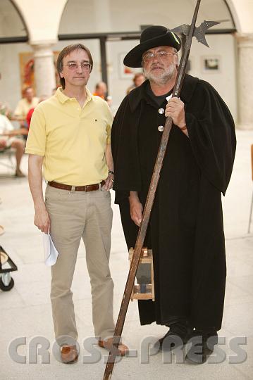 | KAMERA: Canon EOS-1DS | DATUM: 28.04.07 15:34 | AUFLÖSUNG: 2704 x 4064 | ISO-EINSTELLUNG: 100 | BELICHTUNGSMODUS: Auto exposure | BELICHTUNGSDAUER: 1/160s | ÖFFNUNG: 2.8 | BRENNWEITE: 70.0mm | BLITZ: Flash fired | Headline: Feuer & Erde, Kleinregionsfest | City: St.Peter in der Au | Copyright: Jerko Malinar | Caption: Herbert Pauli las aus seinen Dichtungen, im Bild mit Steyrer Nachtwächter. |
