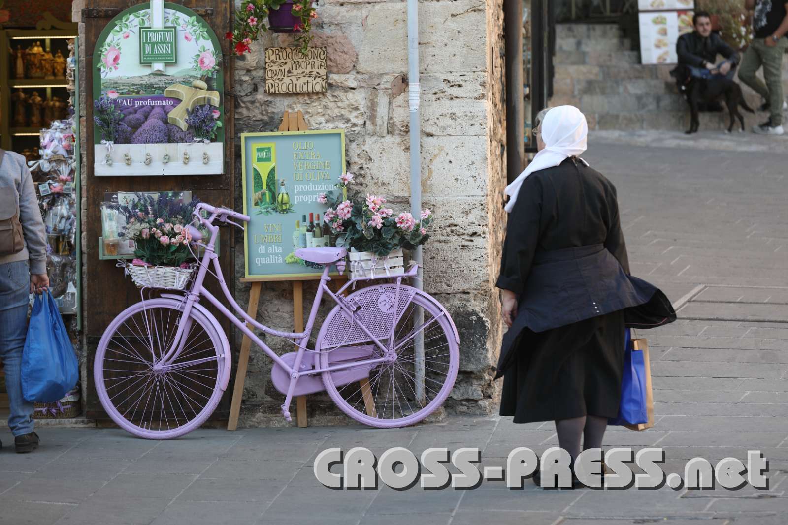 Eine Nonne bewundert das lila blumengeschmückte Fahrrad.