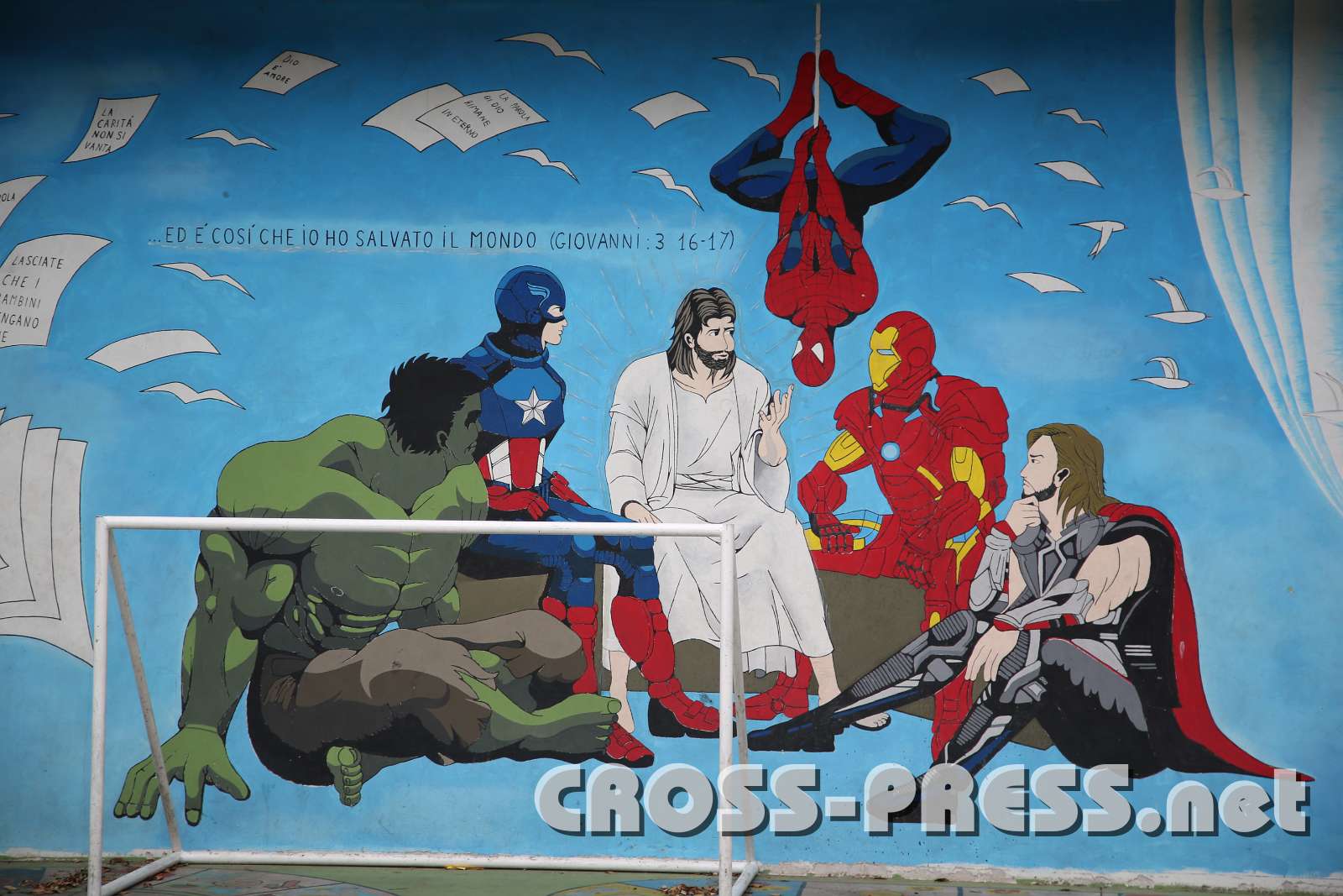 Superheroes unter sich. Jesus: "Und so habe ich die Welt gerettet." :) Zeichnung auf der Spielplatzmauer.