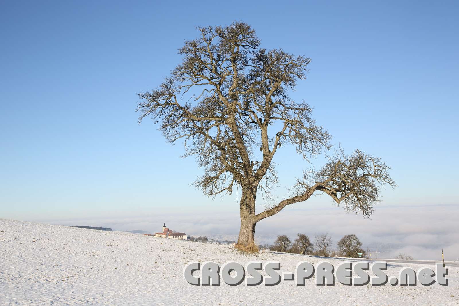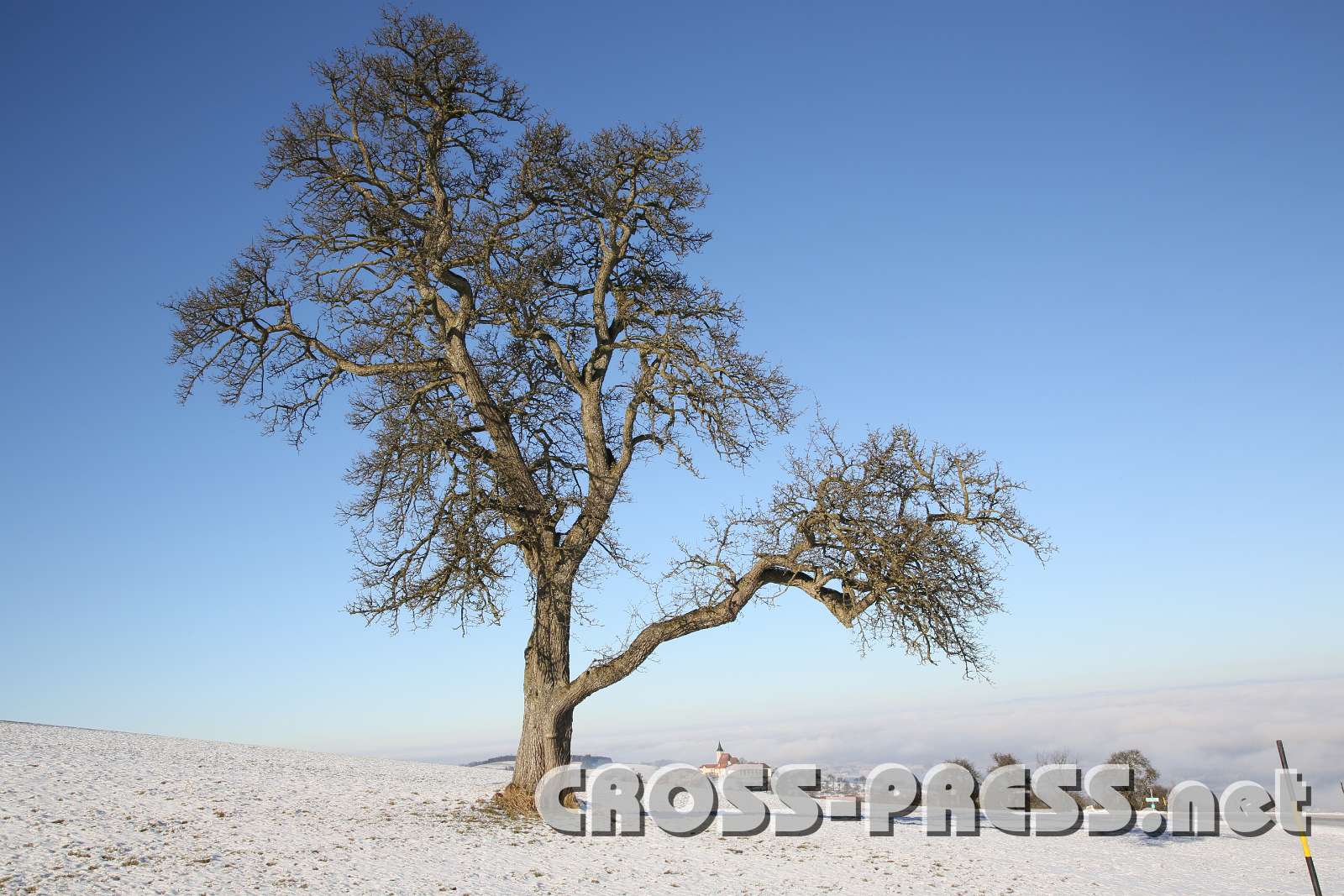 Obstbaum im Winter mit Kirche St.Michael im Hintergrund